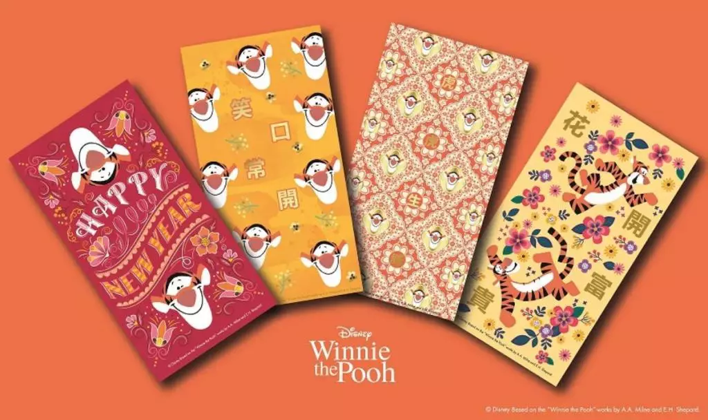 1套4款的利是封用上跳跳虎Tigger歡樂的形象配合繽紛的顏色,還採用了毛毛設計,分別印有Happy New Year、笑口常開、虎虎生威及花開富貴祝賀語句,逗人歡喜。只要於商場內消費滿$600或以2,500 The Point會員積分便可換領。