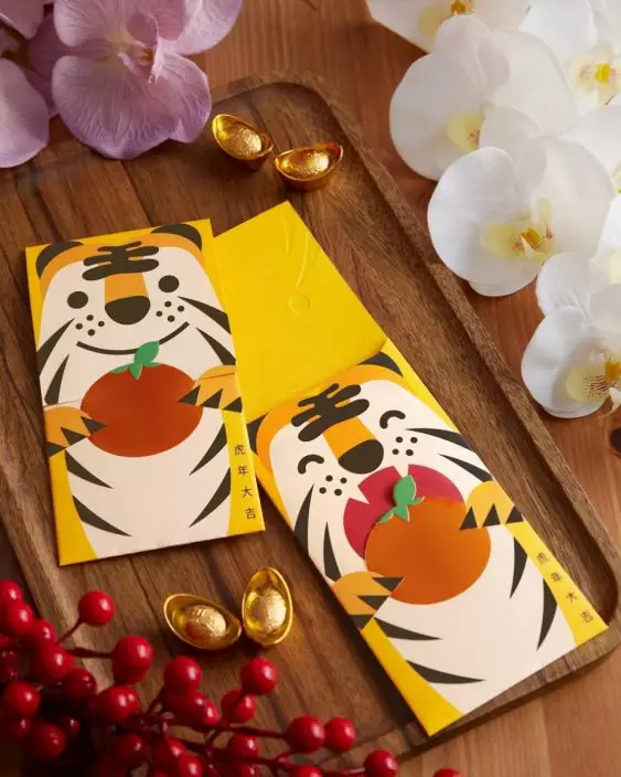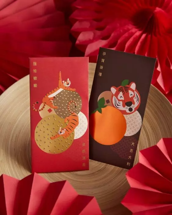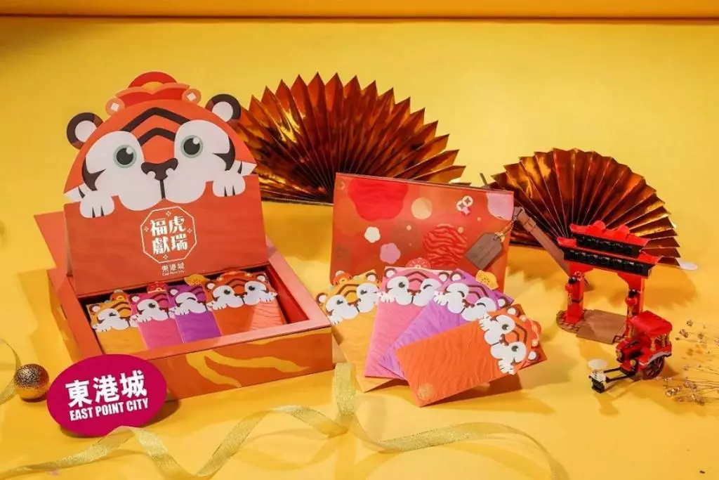 ●Nan Fung Place 虎虎生威利是封 手舞足蹈的卡通老虎身上的斑紋與煙花以壓花製作,利是封中間亦暗藏「笑哈哈」及多顆心型圖案,並以燙金印上煙花,營造閃爍效果。一套兩款的利是封可以變成站立式擺設,將活潑喜慶的老虎變成裝飾。登記成為NF Shopping購物禮遇會員,以電子消費滿$500可獲利是封1套。