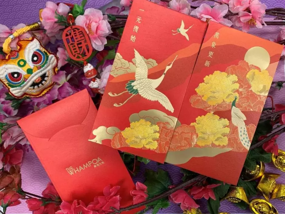 一套兩款利是封以象徵長壽安康的丹頂鶴及百鳥之王孔雀為創作靈感,用上喜慶的紅色揉合吉祥的牡丹花及充滿中國色彩的背景構圖,富麗堂皇又氣韻生動。凡於香港仔中心或黃埔新天地商戶消費滿$200 或以上即可換領利是封。