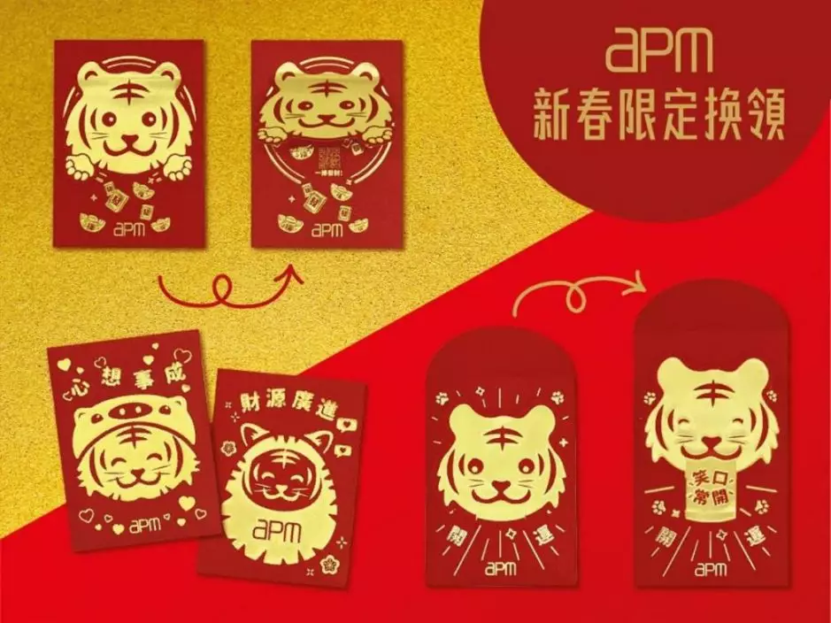 以模切細塑出4款福氣老虎仔,更戴上各賦寓意的傳統特色帽子:包括財神帽、狀元帽、金元寶、紅錦鯉,寓意財源廣進、文采飛揚、喜事連連、幸福美滿。甫打開利是封,即看到以四色燙金打印的吉祥賀語。只需於場內即日單一電子消費滿$300;或The Point會員以1,000積分+即日單一電子消費滿$100換領。