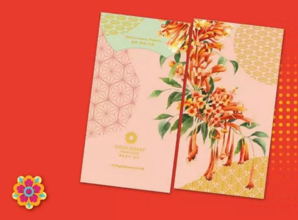 以橙紅色為主調以及高貴燙金設計,搭配金光閃閃的幾何圖案,設計成花開好運利是封,只需於黃金海岸商場以指定電子貨幣消費滿$400或以上,即可換領。