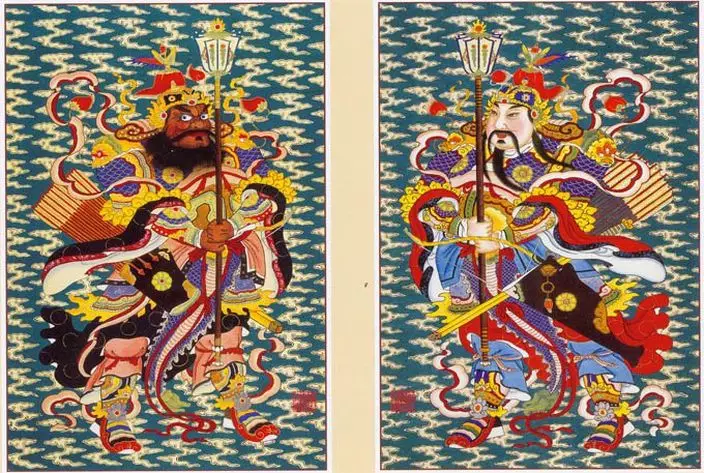 據戰國《山海經》載,神荼和郁壘是遠古時代擅長捉鬼的一對兄弟,他們相貌猙獰,卻心地善良。如惡鬼出來騷擾百姓,他們便將鬼擒伏捆綁,拿去喂老虎。所以古人便在門上畫上這對捉鬼兄弟的像來驅鬼避邪。直到唐代,這對捉鬼兄弟才被「卸任」,由唐代大將秦瓊和尉遲恭接任門神一職。