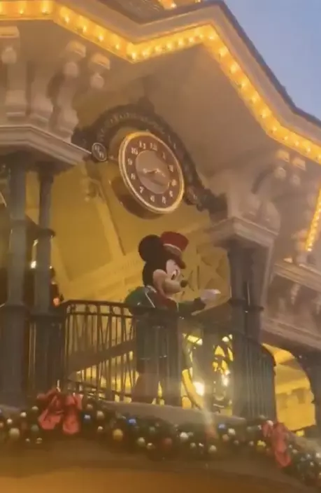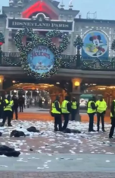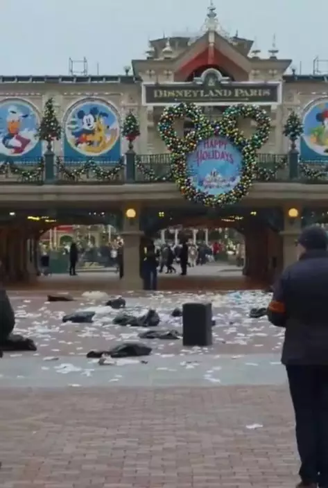 巴黎迪士尼清潔員大罷工致門口垃圾堆積,吉祥物米奇照常迎賓。影片截圖
