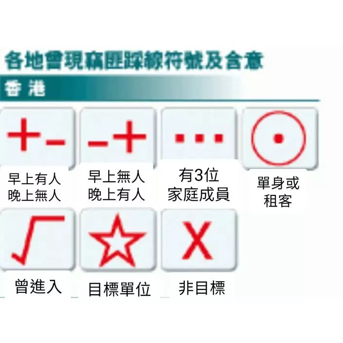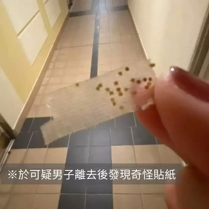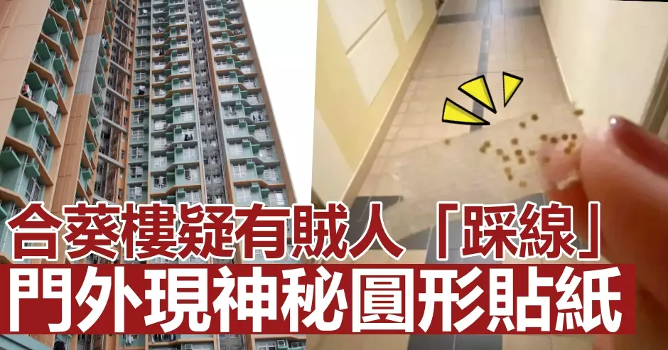事主透露,該名男士離開後,發現門外牆壁貼有一張從沒見過的貼紙,從相中可見,貼紙上有多個圓形符號,懷疑是賊人「踩線」留下的記號。他又指,因合葵樓尚未有確診個案,該名男子為檢疫人員的可能性不大。