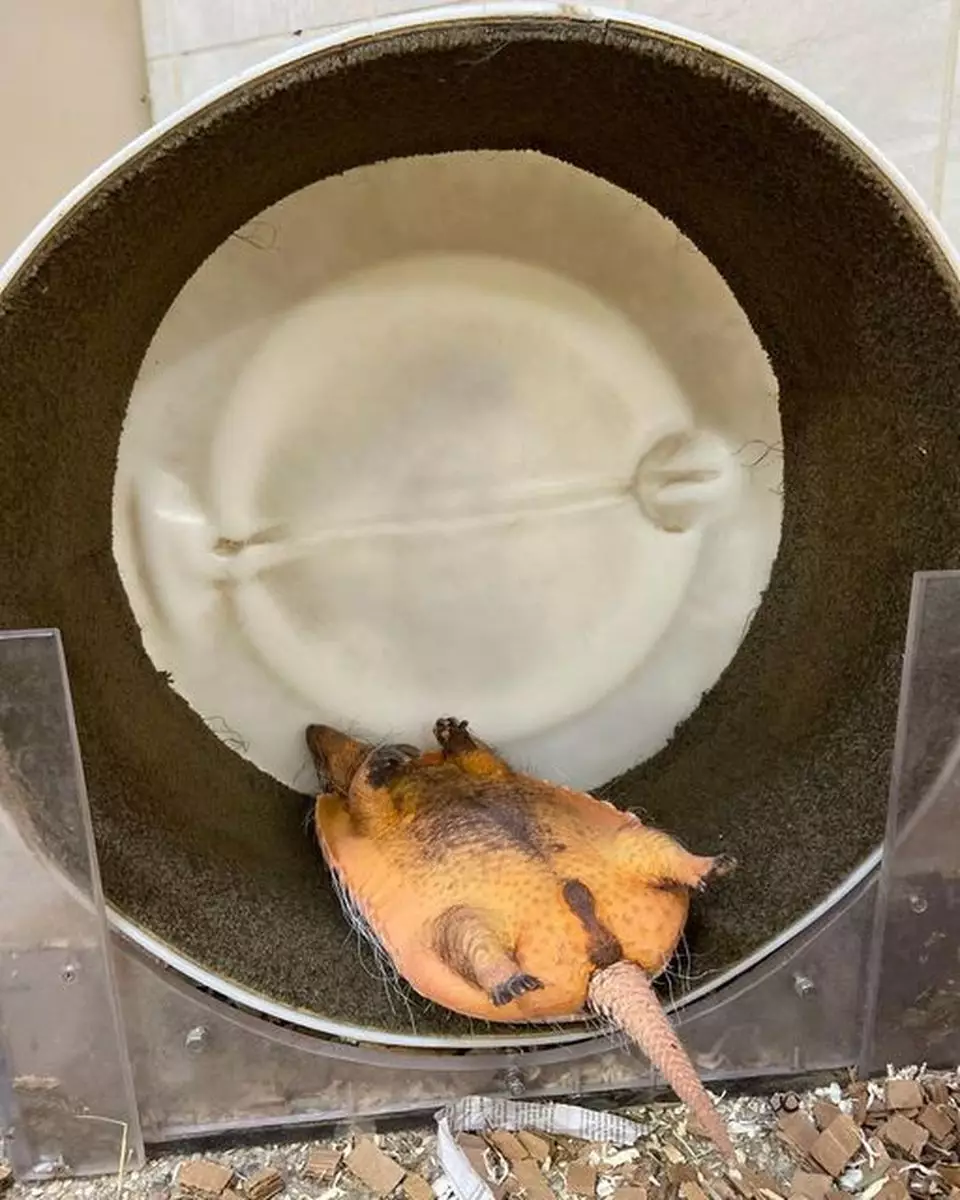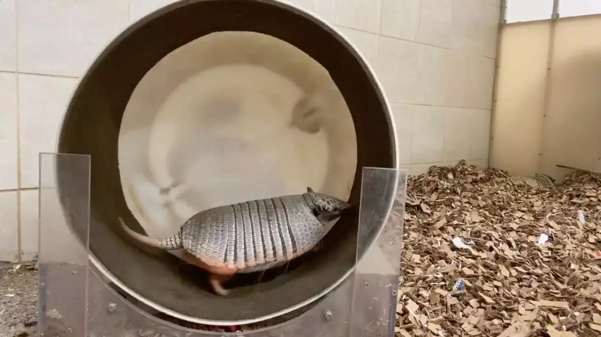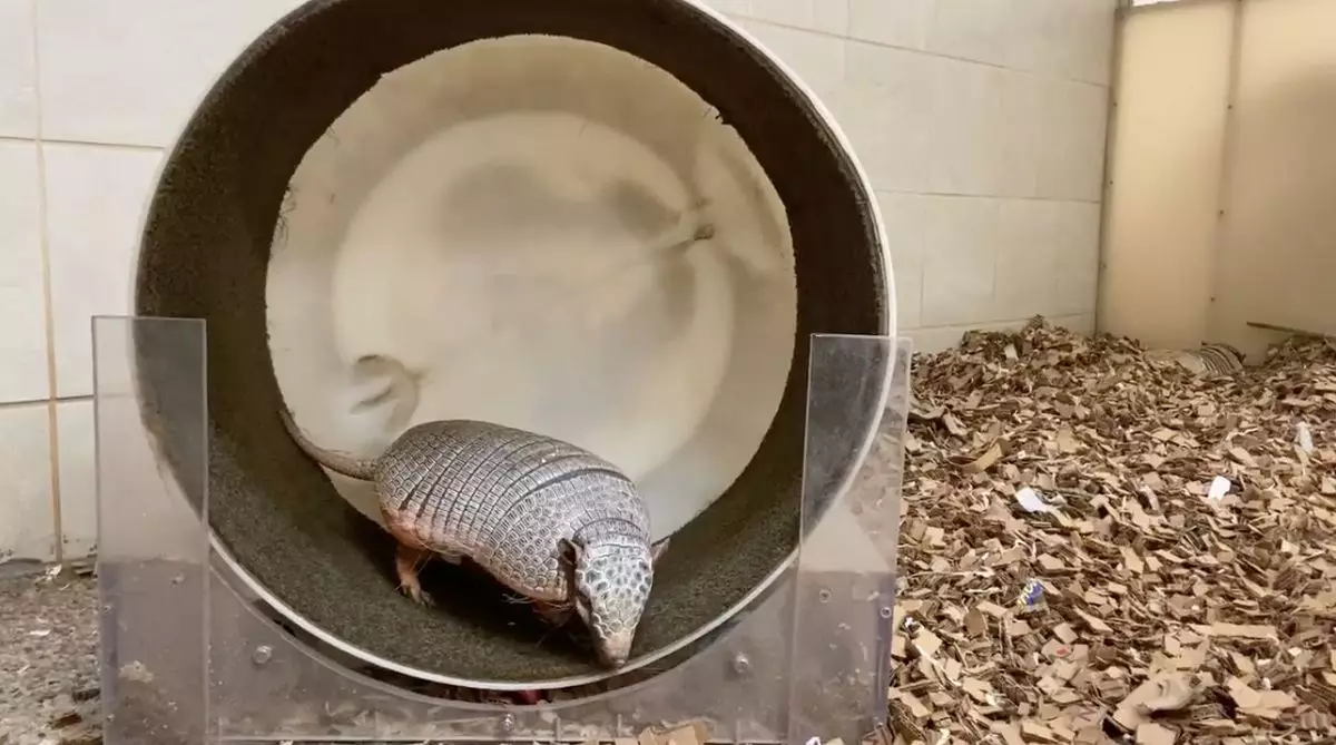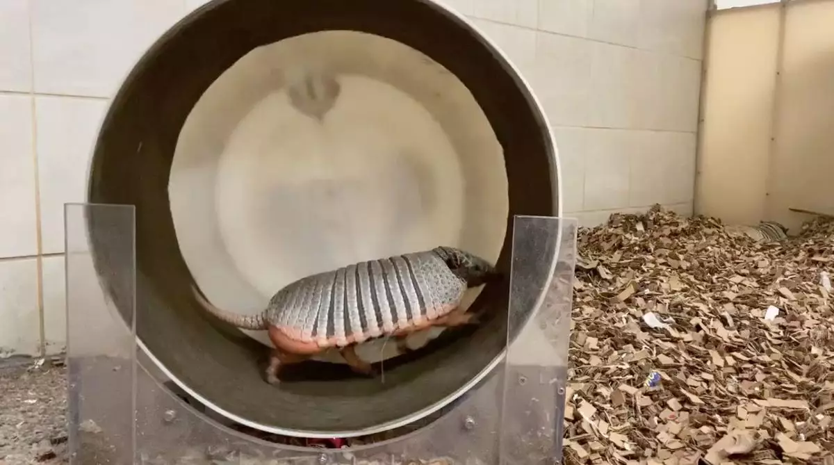居住在辛辛那提動物園(Cincinnati Zoo & Botanical Garden)的犰狳「Juanita」是園區內的人氣動物,因為身型太過豐滿,所以飼養員為牠準備了滾輪,並在每年的第一天開始督促牠運動,但今年牠只堅持了四天就放棄了,更將滾輪當作「搖搖床」,翻着肚子躺在上面,chill到爆啊!