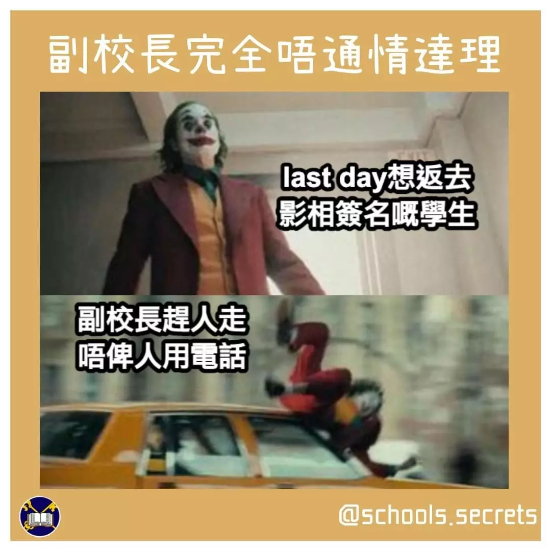 對大多數學生來說,從學校畢業的那一日格外重要,大家都想和同學老師合影紀念並做最後的道別。但日前卻有來自本港一所中學的應屆DSE考生在社交平台發文抱怨,指該校的一名女副校在last day以防疫為由將拍照簽名的學生趕走,令他斥對方不配做老師,更感歎「中學last day一生人一次,老實講要比個咁既人趕走真係好不忿」,事件曝光後吸引不少網友熱議。