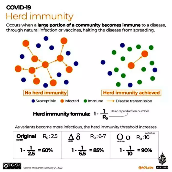 無論如何,香港施打的兩種疫苗都相當有效,但到底接種疫苗到多少人口比例才夠? 按《刺針》的分析,原始新冠病毒的有效傳染數(RO,Effective reproduction number)是2.5,有效疫苗接種率到達人口的60%,已能達到群體免疫的相的。但Delta病毒的RO是6至7,有效疫苗接種率要去到85%,才能達到群體免疫。Omicron病毒的傳染性更強,RO是8,最壞可以高到10,有效疫苗接種率要高到90%,才能群體免疫。