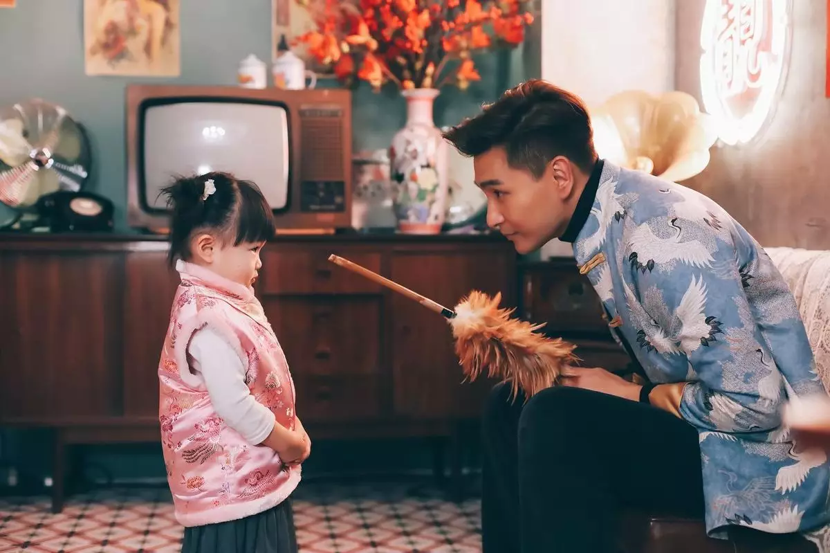 陳展鵬昨日(3日)年初三於IG分享與女兒小豬比的合照,作狀互相用藤條「開年」,相當搞笑,相信係早前一家三口影全家福時拍的。前日(2日)陳展鵬透露小時候影全家福是每年的指定動作,當他長大後有段時間覺得這種習慣有點老土,不過現在大家流行打卡,新一年好開始,他一家三口特別穿上中式服裝到影樓影相留念。