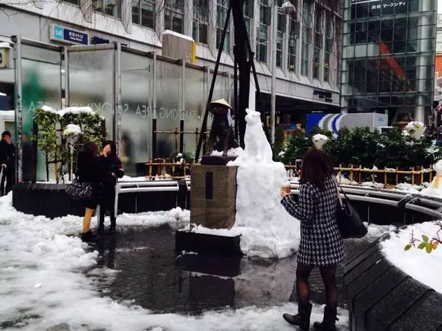 日本人相約澀谷車站,往往都會約在「八公」像前。有時候,太陽很曬時會有路人打開太陽遮;下大雨時也會有放把遮為牠擋雨;而這幾天下暴雪,有人就為「八公」戴上斗笠,感覺很溫馨。