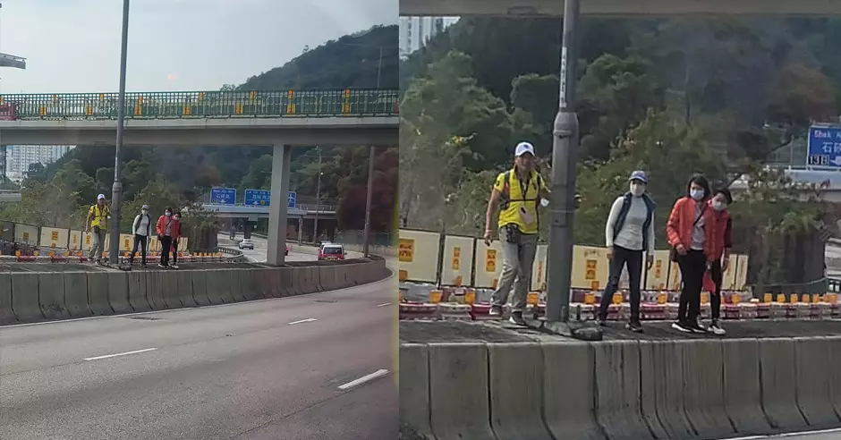 有網民在FB群組「馬路的事討論區」發帖,指有4人在龍翔道近畢架山花園位置橫越馬路,相當危險。據網民分享照片所見,這4人身穿行山裝備,站在路中心石壆,打算橫越馬路。然而諷刺的是,一行人頭上便是行人天橋,而4人眼睛所望方向,更與車流相反,令人不明所以。