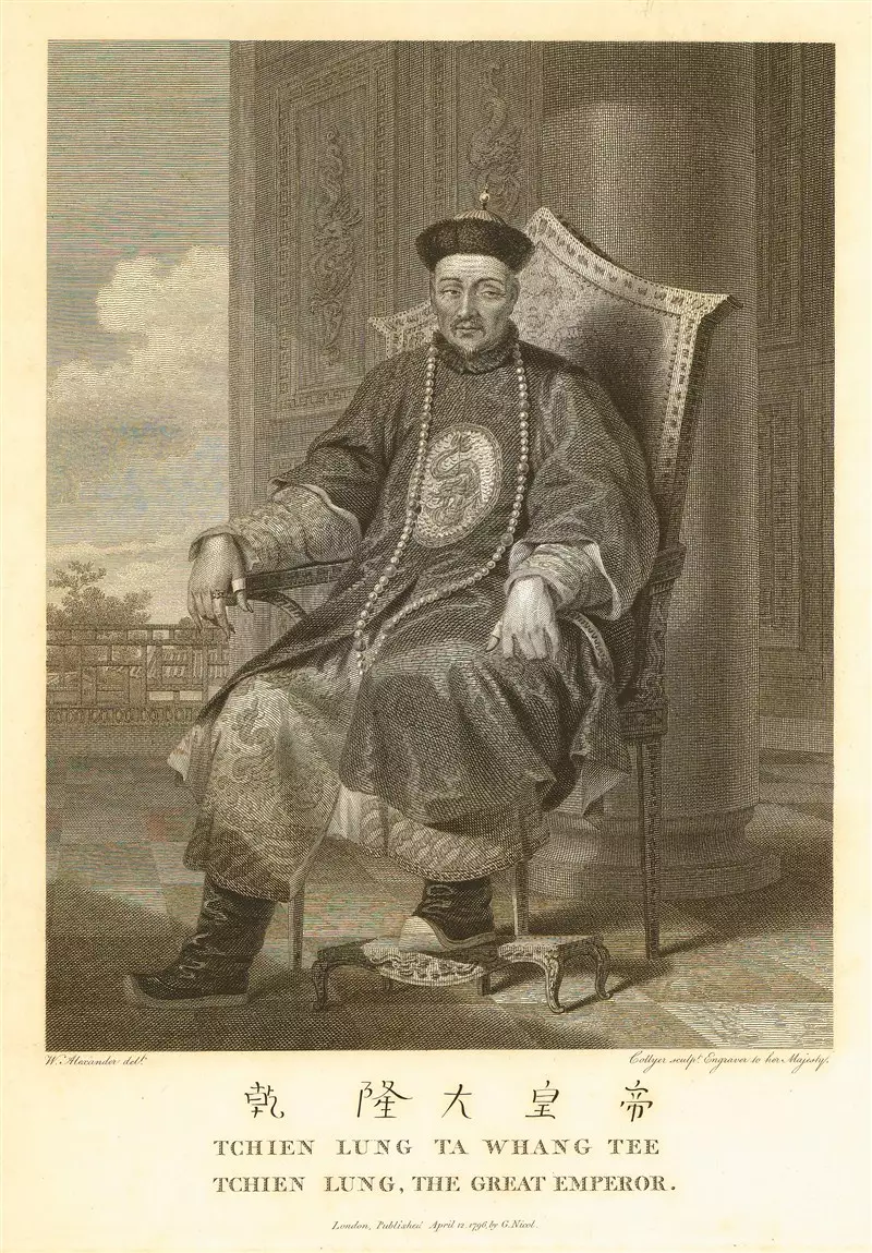 不過,到了1793年,英國命馬戛爾尼,率龐大使團來華,並在熱河行宮覲見乾隆。當時,一名年輕英國畫家威廉‧亞歷山大(William Alexander)作為使團的隨團畫家助手而來,他除了繪畫了大量反映當時中國世態風情的畫作之外,他的著作《中國衣冠風俗圖解》中,也有描繪乾隆皇帝。我們可從不同的角度,來看看另一畫家筆下的乾隆真貌。