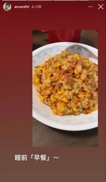 MIRROR成員盧瀚霆(Anson Lo)工作不斷,日前為新歌拍攝MV拍足25個鐘頭外,最近亦忙於電影拍攝工作,幾乎每天都日夜顛倒的他,昨日(9日)在IG限時動態貼上靚仔自拍照,並留言:「6:40AM迫自己唔好瞓着!」兩小時後,他再興奮舉起V字手勢,表示:「子傑收工~8:45AM」最後更貼出一碟炒飯表示睡前「早餐」才去休息。