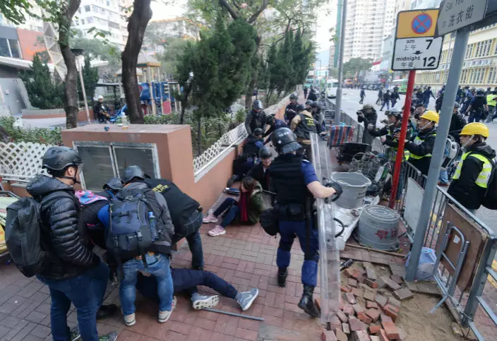 報道指警方與現場示威者對峙了約一個半小時,示威者仍不離開,反而用自製盾牌衝撞警方,並不斷向警員投擲磚塊和雜物。警方隨即展開行動,用盾牌和胡椒噴劑驅離示威者。在警方執法過程中,有警員受傷,警方兩次鳴槍示警。