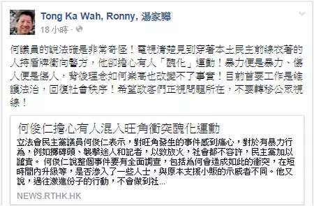 湯家驊驚大家唔知何俊仁講過乜,仲貼埋港台報道何俊仁的評論。 何俊仁話,「對旺角發生的事件感到痛心,對於有暴力行為,例如擲磚頭、襲擊途人和記者,以致放火,社會都不容許,民主黨加以譴責。整個事件要有全面調查,包括為何會造成如此的衝突,在短時間內升級等,是否滲入了一些人士,與原本支援小販的示威者不同。他又說,過往激進份子的行動,不會做到社會不可接受的行動, 擔心是否有人混入其中,醜化整個運動。特區政府的管治,令矛盾加深,民怨累積。」