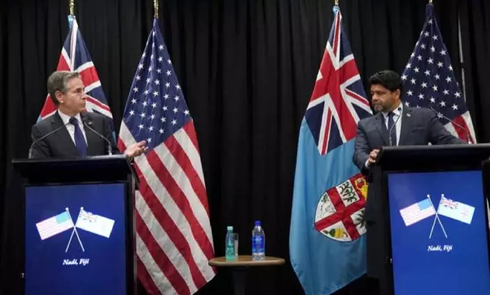 美國國務卿布林肯2月12日到訪斐濟,與斐濟總理聯合舉行記者會。