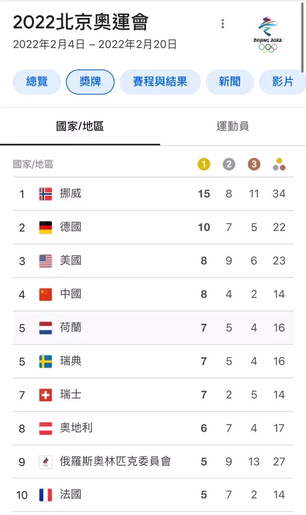 北京冬奧獎牌榜頭10位。