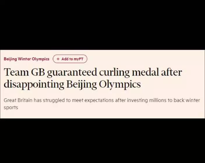 《金融時報》將英國隊本次冬奧會之旅形容為「艱難」(struggle)、「失望」(disappointing),並稱同中國隊本屆冬奧會的出色表現形成了鮮明的對比。目前,中國隊在獎牌榜上排名第4,已獲得了8枚金牌。《金融時報》報道稱,表現優異的中國隊運動員,包括包攬兩金一銀的谷愛凌以及單板滑雪明星選手蘇翊鳴,成功在中國點燃了冬奧會的人氣。