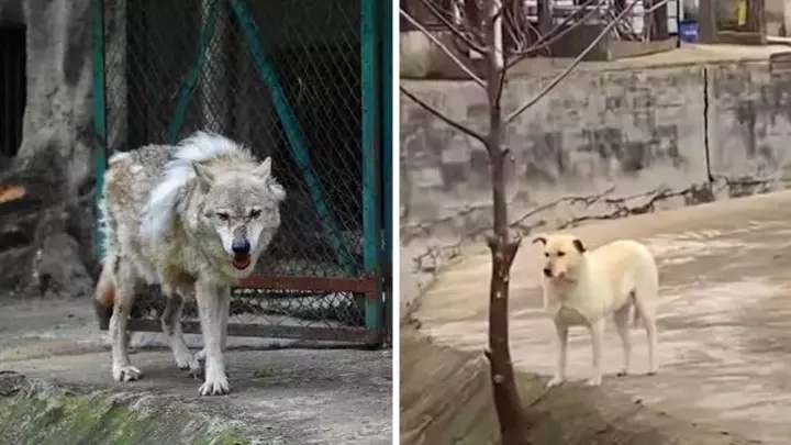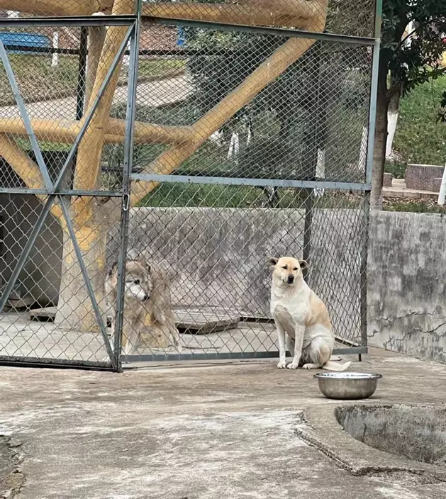 武漢一動物園安排了一頭唐狗,與孤獨的老狼王相伴,引發網民熱話。網上圖片