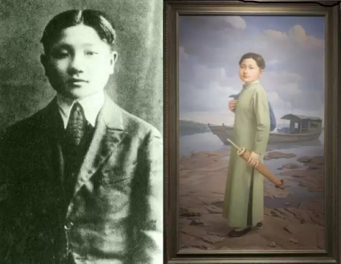 現實中和畫家眼中的少年鄧小平。中央美術學院畫家張豪辰這張《東門惜別》描繪了1919年鄧小平從家鄉廣安渠江東門碼頭出發前往重慶準備赴法國留學的場景。