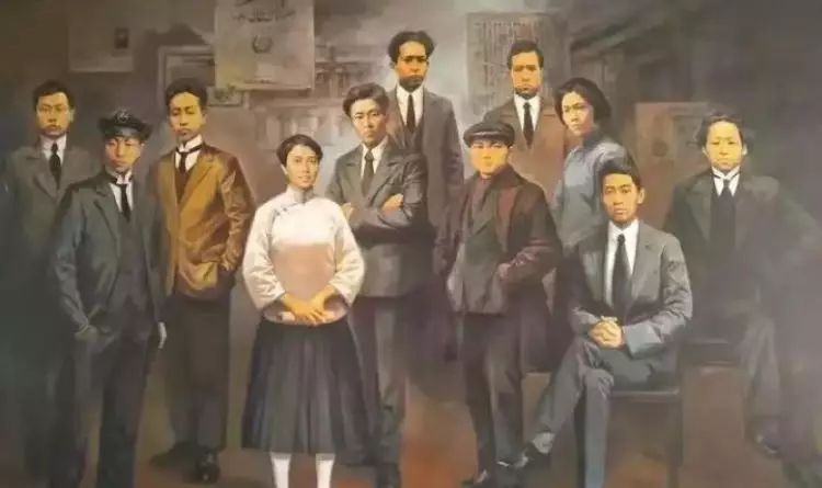 油畫《赴法勤工儉學》。從左至右:陳毅、聶榮臻、趙世炎、向警予、蔡和森、 李維漢、鄧小平、李富春、蔡暢、周恩來、王若飛。(圖源:留法勤工儉學運動紀念館)