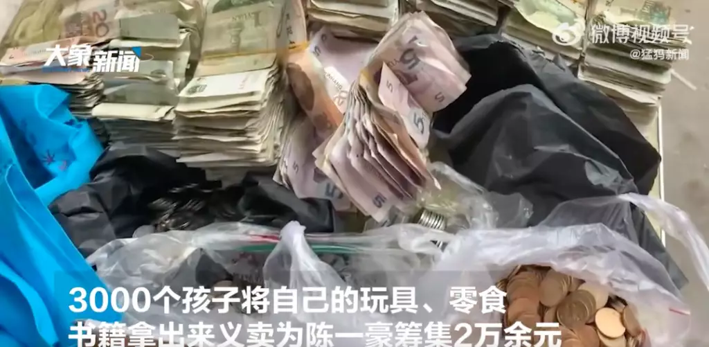 小豪的病情一直牽動母校師生的心,日前河南駐馬店近十所學校共同發起倡議,為小豪組織了一場義賣籌款活動。3000名學生將自己的玩具、書籍、零食拿出來義賣,共籌集了2萬餘元捐給小豪。五角、一元、五元、十元……一沓沓碼好的零錢鋪滿了整張桌子,終於為小豪送上大家的愛心,希望他能早日康復。