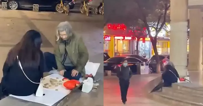 傍晚寒冬街頭,女子陪流浪的老人下棋,兩人席地而坐,只見他們用白紙攤開當棋盤,在寒風中博弈。影片拍攝者說道:「當時是這樣的,我在外面吃飯,從飯店出來的時候,寒風蕭瑟,然後無意中在路邊看到,一個女孩坐在地上,跟一個老人在那裡下棋,我看到後當時就覺得挺感動的,然後就用手機拍攝下來了,第一次見到這種溫馨的場景。」兩位棋友在博弈中溫暖了這個冬夜。