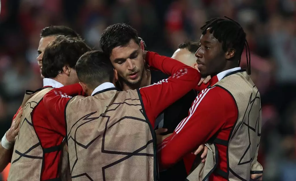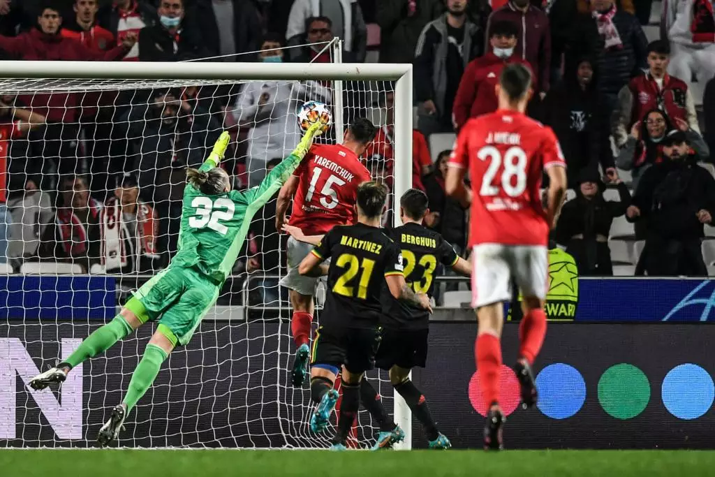 耶梅卓克(15號)門前衝頂破網,為賓菲加追平阿積士2:2之後,這名烏克蘭國腳沒有興奮慶祝,反而走到場邊,掀起球衣展示印有烏克蘭國徽的T恤,以示支持戰火下的祖國,而一眾隊友亦紛紛擁抱他。AP/REUTERS/網上圖片