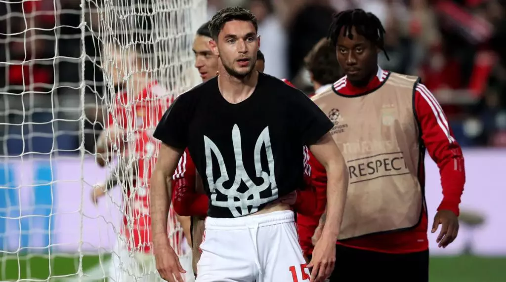 烏克蘭和俄羅斯爆發戰爭,前者的外流球員紛紛在球場上以行動聲援祖國。譬如賓菲加周三歐聯十六強首回合主場2:2和阿積士,主隊的烏克蘭前鋒耶梅卓克破網後脫去球衣,展露出印有烏克蘭黑色國徽的內衣,以示支持國家抵抗外敵入侵。