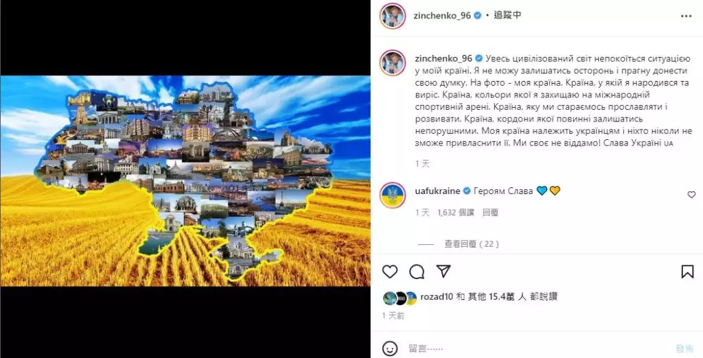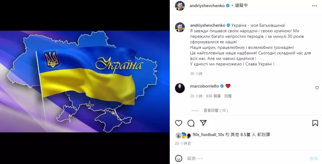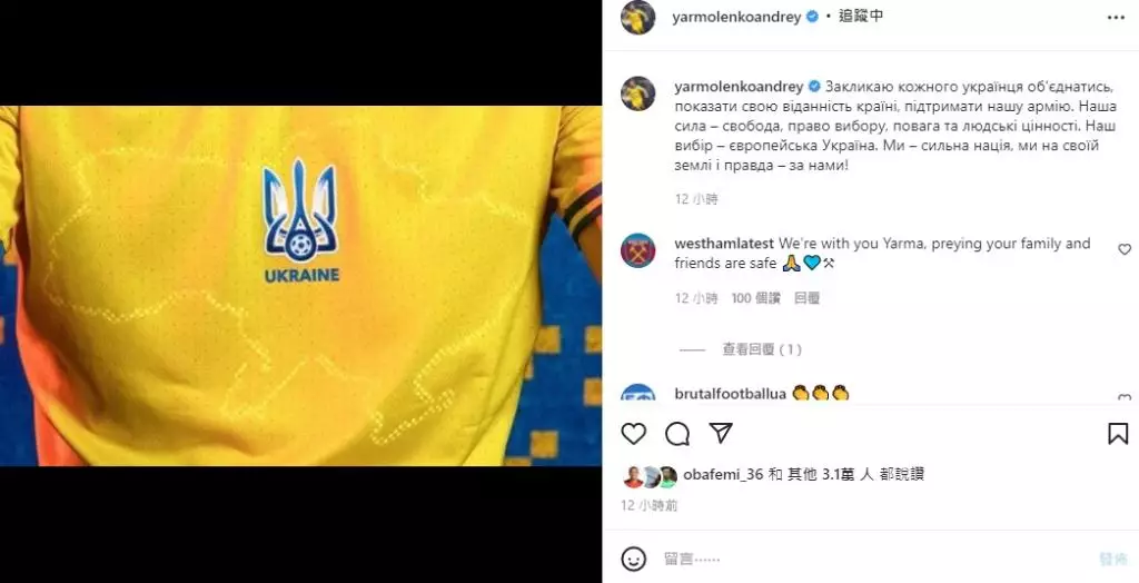 上起:烏克蘭傳奇舒夫真高、現役國腳包括效力曼城的辛真高,以及韋斯咸的耶莫蘭高,都在IG表心跡,永遠支持烏克蘭。網上圖片