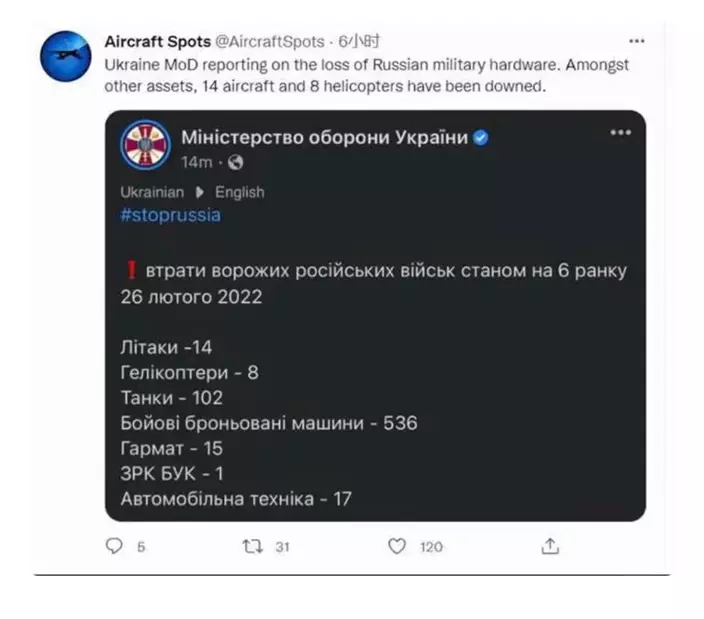 據報道,烏克蘭國防部副部長漢娜·馬里亞爾(Hanna Malyar)在臉書發佈消息稱,截至當地時間2月26日上午6時,俄軍損失14架飛機,8架直升機,102輛坦克,536輛裝甲戰車,超3000人陣亡等。