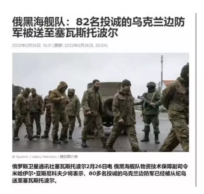 俄羅斯衛星通訊社26日從塞瓦斯托波爾發回的報道稱, 俄黑海艦隊物資技術保障副司令米哈伊爾•亞斯尼科夫少將表示,82名投誠的烏克蘭邊防軍今天已經搭乘「沙赫傑爾」號救助拖船從蛇島被送至塞瓦斯托波爾。衛星通訊社當天發佈的畫面中包括烏軍人乘坐的船隻到港的畫面,視頻畫面中還特別給了印有船隻名稱的船頭一個特寫畫面,還有被俘虜的烏軍人下船後排著隊領取食品與礦泉水的畫面。俄方可能就是希望通過這些很具體的細節來佐證這些消息的真實性。