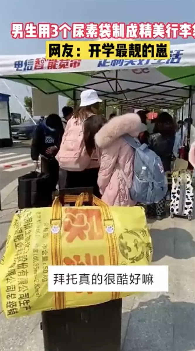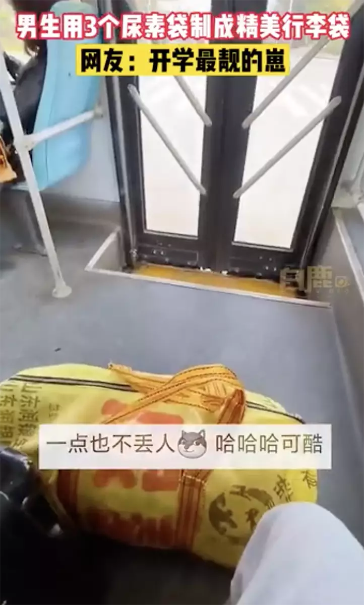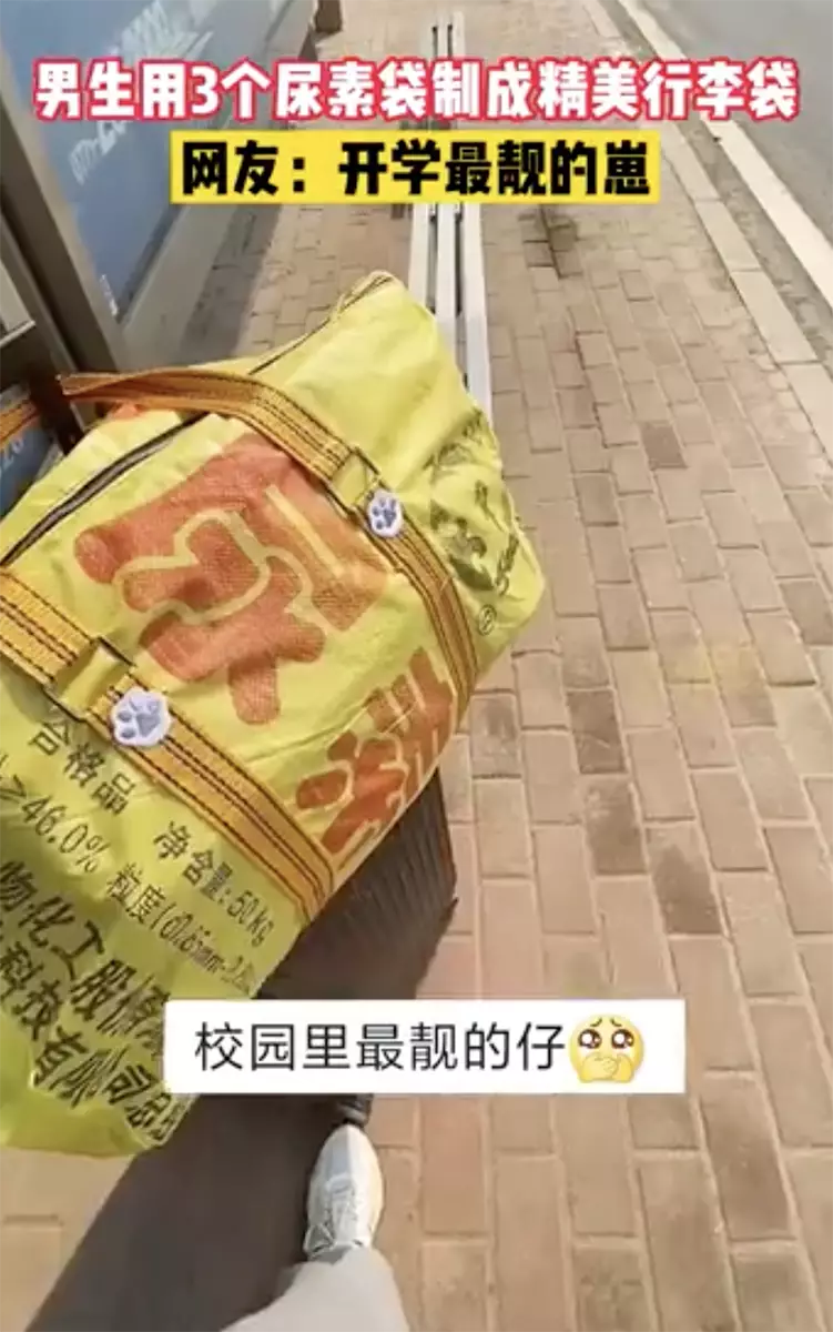 據內地媒體報導,廣西南寧南寧理工學院的吳同學為了打包帶去學校的衣物,決定廢物利用,以家中閒置的尿素口袋,自己設計、剪裁、縫製了一個精美的行李袋。據吳同學透露,行李袋用了3個尿素袋做成,自己整整做了一天才完工。