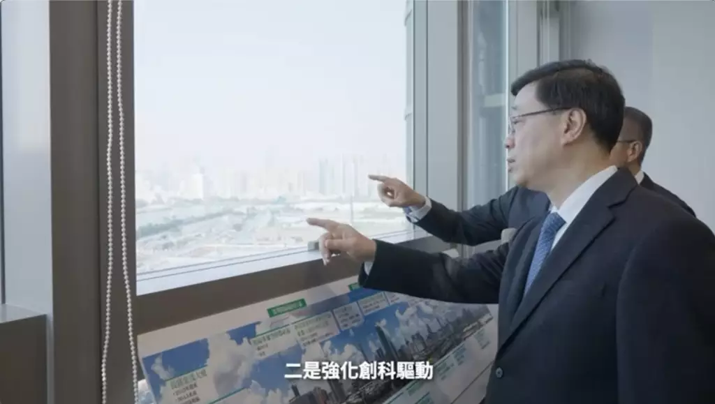 李家超提到,在經濟方面,河套香港園區順利開園,為「國際創科中心」揭牌。全年股市暢旺,旅遊業持續復蘇,啟德體育園、東九文化中心相繼啟用,「粵車南下」帶來高端消費旅客。
