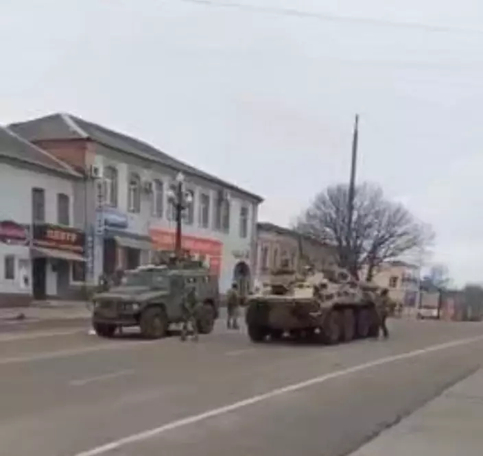 有俄羅斯裝甲車和軍隊在赫爾松市街上巡邏。