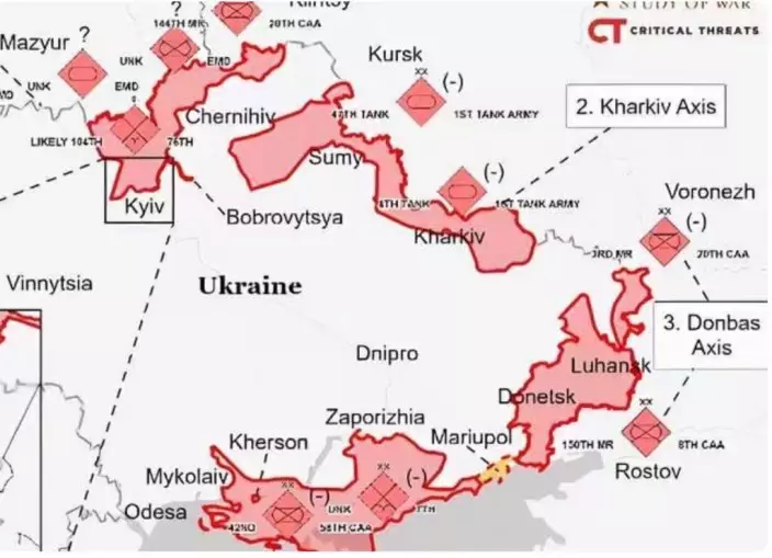 此前衛星圖片拍攝到的俄軍長達40英里的裝甲車隊,沒有更新動態。但有消息稱,它們仍在「緩慢而堅定地推進」。