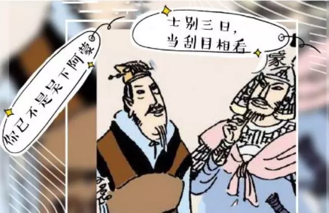 魯肅不禁用手拍著呂蒙的背說:「我原本以為老弟只會帶兵打仗,今天一談,方才知道老弟學識英博,已非當日那個粗漢子吳下阿蒙了!」呂蒙一聽,立即回應道:「這就叫士別三日,應該刮目相待了!」