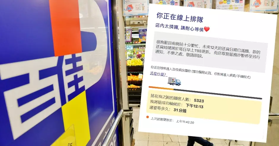 星島日報記者實測,上午約11時42分進入百佳網站,系統顯示有5323名顧客排隊,輪候時間需逾半小時。百佳亦提醒,現時網站十分繁忙,未來12天的送貨日期已滿額,新的送貨時間將於每日早上11時更新;而店取易服務亦暫停至另行通知。
