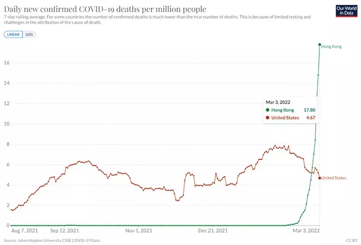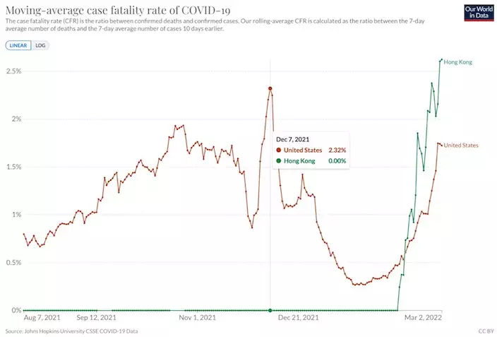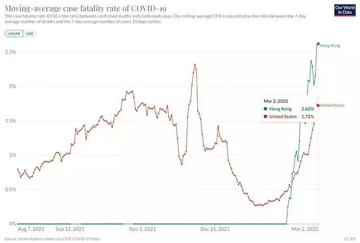 由Ourworldindata根據約翰·霍普金斯大學數據製作的圖表可見,香港目前的確診死亡率已經高達2.62%,超越了美國在2021年12月高峰時期的2.32%,而美國現在的確診死亡率只有1.72%,香港現時的確診死亡率比美國高52%。