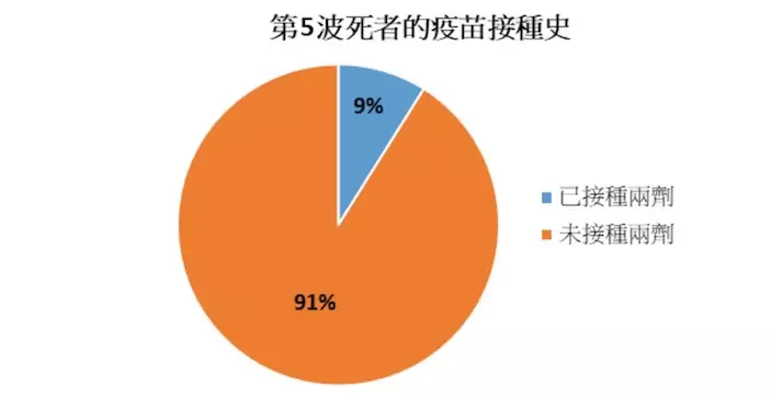 第五波死者中,超過九成人士未接種兩劑疫苗。(數據來源:衞生防護中心)