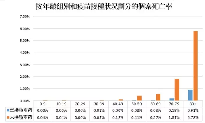 數據顯示,接種兩劑疫苗人士,死亡率低至少5倍。(數據來源:衞生防護中心)