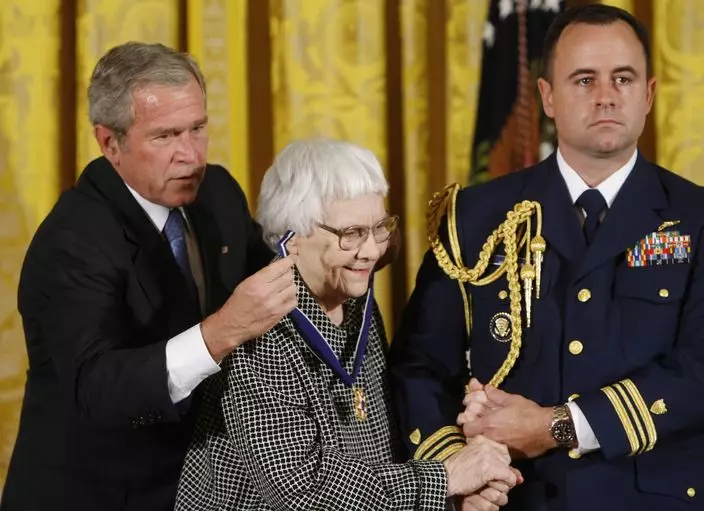2007年,哈珀.李從時任總統喬治布殊手上接過最高榮譽的總統自由勛章頒。(AP圖片)