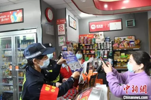 梁慧等「巾幗先鋒隊」隊員和社區志願者一起進店開展防電信詐騙宣傳。 蔣雪林 攝