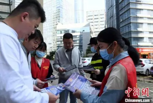 梁慧等「巾幗先鋒隊」隊員和社區志願者街頭開展防電信詐騙宣傳。 蔣雪林 攝