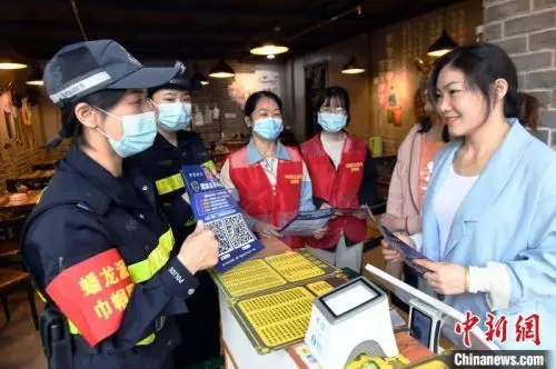 梁慧等「巾幗先鋒隊」隊員和社區志願者一起進入商店開展防電信詐騙宣傳。 蔣雪林 攝