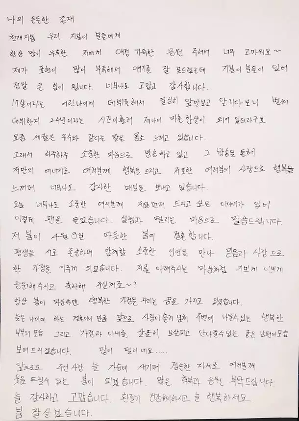 韓國著名節目主持Boom今日(10日)透過親筆信宣布喜訊,他將會在4月初迎娶交往已久的圈外女友,正式踏入人生新階段。