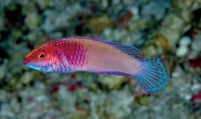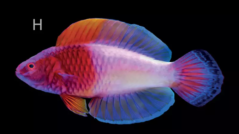 而最令人驚歎的是,「彩虹仙女瀨魚」成年雄性有著標誌性的體色,從橙紅色、粉紅色、桃紅色、橙黃色到綠藍色、靛青色與深紫色,搭配上深淺不一的鱗片與鰭間線條,視覺效果的豐富程度甚至超過彩虹,美輪美奐。