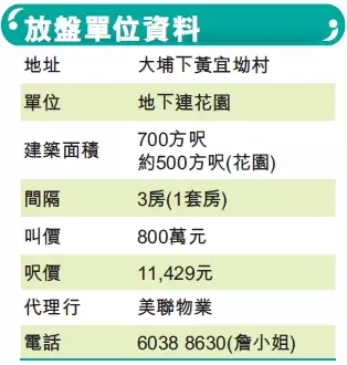 大埔區雲集不少村屋,其中下黃宜坳村位於大埔滘,鄰近低密度住宅雍怡小築及雍怡雅苑,起居寧靜。今次走訪該村的地下連花園戶,建築面積700方呎,3房1套設計,全屋有雅裝,並附有約500方呎花園,外望附近村屋,業主現叫價800萬,建築呎價約11,429元。