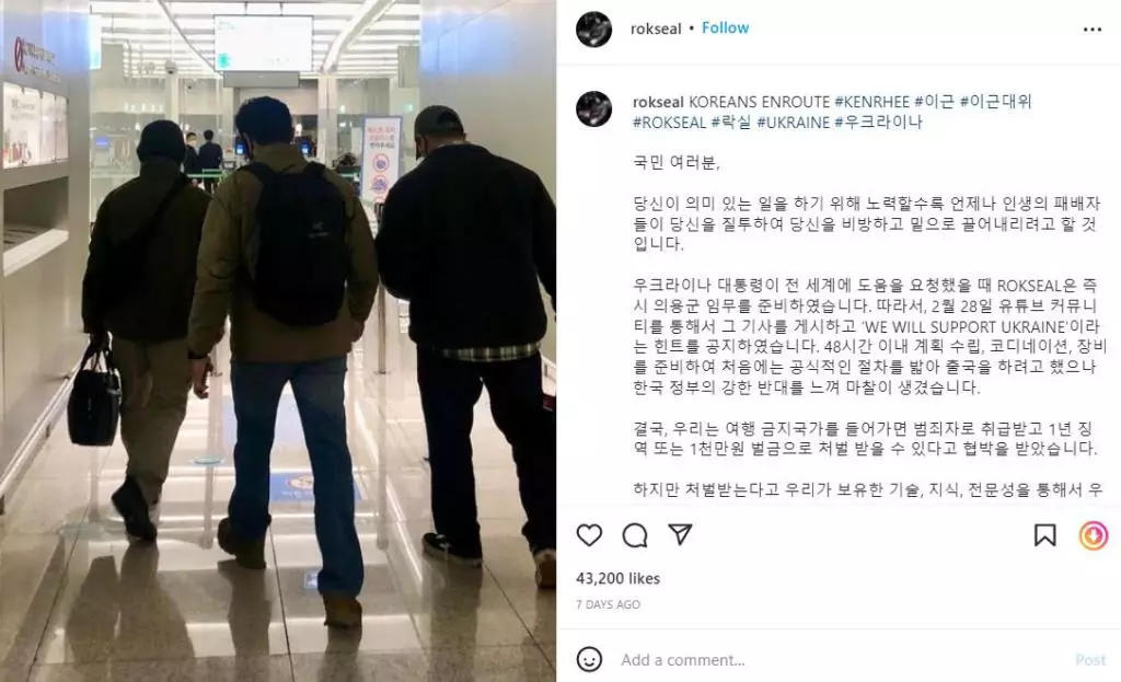 李根大尉曾參加韓國海軍特戰隊,退役後開設YouTube頻道分享軍事訓練及特種部隊戰術技巧等影片。上周他於IG表示他是首批到達烏克蘭支援的韓國志願者,但他的行為就遭韓國政府批評,指如果韓國國民到禁止前往的國家,將被視為犯法,最高可判處監禁一年,及罰款1000萬韓幣(約6萬港元)。但李根大尉堅持以其戰鬥經驗及知識,飛抵烏克蘭支援,並指返韓願接受懲處。