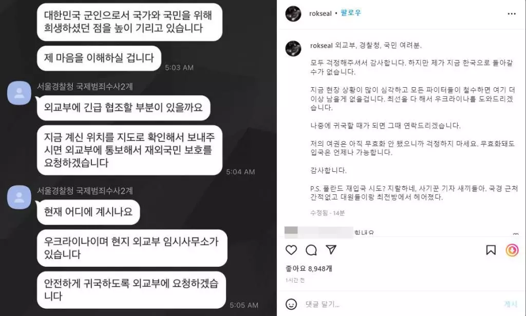 面對種種傳言,在戰場上的李根大尉都忍不住要出聲,今日(15日)終在IG發文報平安,批評亂傳他狀況的人,又希望大家不要再找他,「在完成任務之前不會再有我的消息,我每天都忙着戰鬥。」期間透露他的同伴已安全撤離烏克蘭,本來以韓國團隊抗俄的他,現時正獨自留在義軍參戰。他澄清自己不曾到烏克蘭邊境嘗試進入波蘭,希望大家不要再亂傳假新聞。隨後再出另一篇帖文,表示謝謝大家的關心,「現在情況很嚴重,一旦所有的戰士都離開了,這裡就沒有人了。我們將盡最大努力幫助烏克蘭。」並透露回家的時候才會再更近狀況,亦請大家別擔心,他的護照仍然有效,但即使有機會無效他仍能出入烏克蘭。有關發文他在公開數小時後又即再刪除,似乎亦希望儘量不影響作戰。