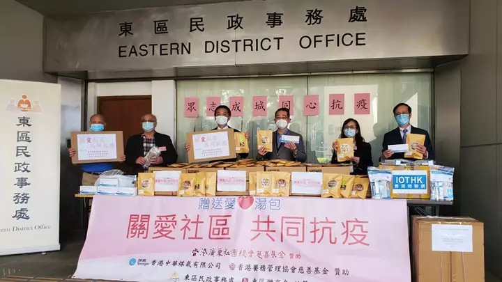 東區民政事務處及東區體育會統籌,香港廣東社團總會慈善基金、香港餐務管理協會慈善基金及煤氣公司共同贊助的「關愛社區、共同抗疫愛心湯包」贈送儀式,今天於東區民政處進行,出席嘉賓包括東區民政事務專員陳尚文、社會福利署東區及灣仔區福利專員胡美卿、廣東社團總會慈善基金秘書長楊位醒、香港餐務管理協會慈善基金主席潘權輝等。